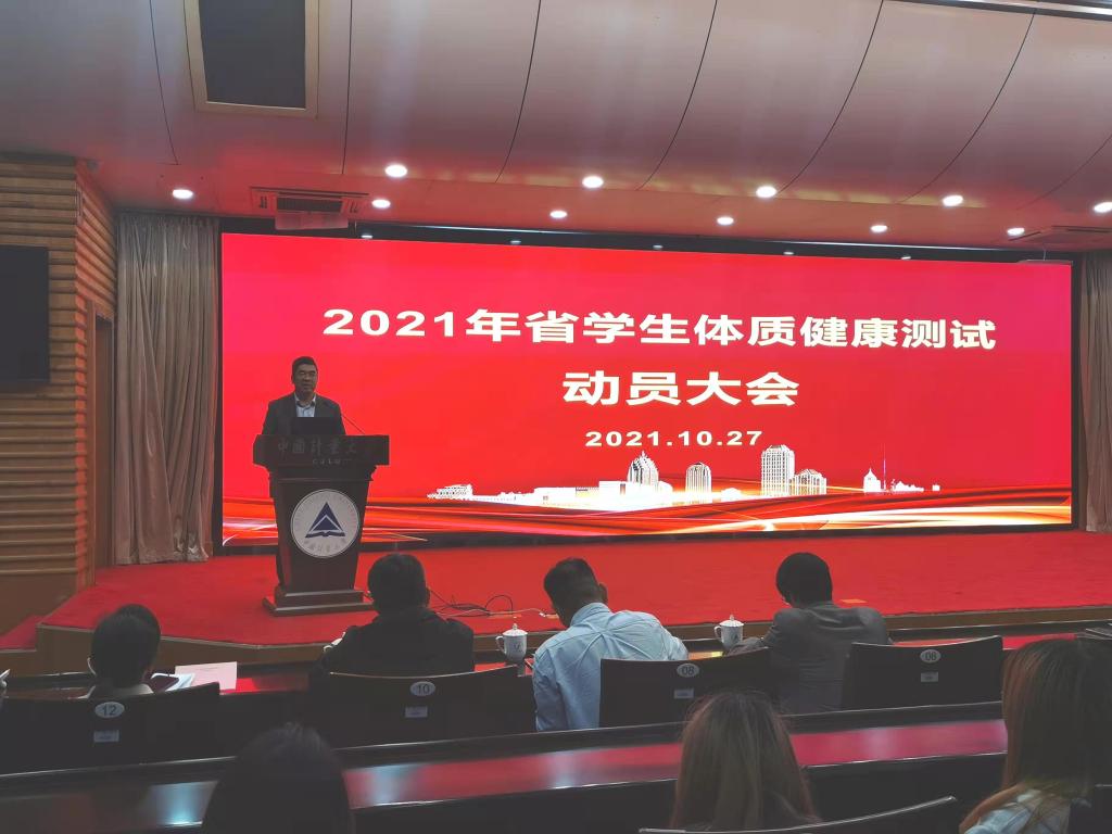 10月27日下午,体军部在闻厅二楼会议室组织召开了2021年省学生体质健康测试动员大会,副校长葛洪良、抽测学院领导、体军部相关人员及全体参测学生参加会议。葛洪良在会上作了动员讲话,他强调了学生体质健康测试的意义,号召学生形成良好锻炼习惯,鼓励学生精神饱满地去迎接测试。学院、体军部领导依次发表动员讲话,呼吁大学生应将体测视为一种身体的锻炼与自我的挑战,每位同学都应积极参与,尽最大努力展现自我,并再次叮嘱了各项激励政策和训练纪律,极大调动了学生的测试积极性。三个学院的学生代表分别上台进行了谈了自己的训练心得和对测试的信心。最后体军部进行了细致的测试流程讲解,确保省抽测能有条不紊地推进。