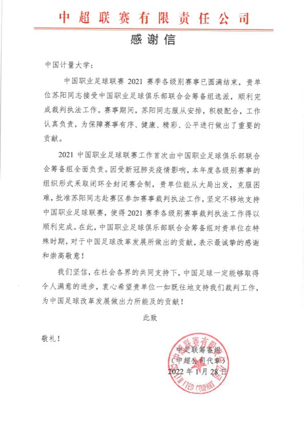近日,我校收到来自中足联的感谢信,中足联衷心感谢学校在2021赛季对其工作的大力支持,感谢体军部国家级裁判苏阳老师接受选派并在联赛执裁期间的辛勤工作和敬业精神。