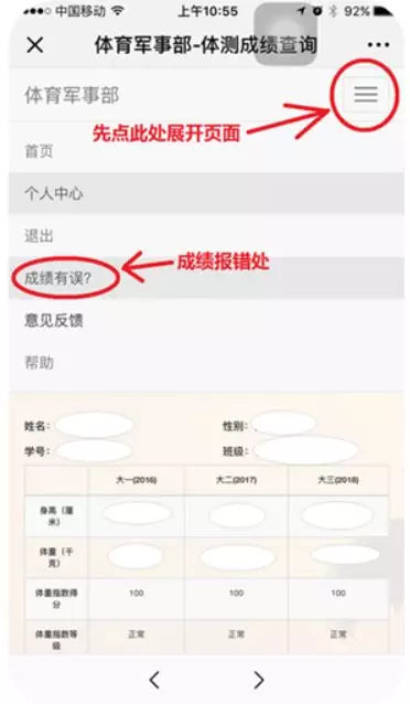 若遇未尽之处,请进入微信公众号“计量体质测试”,如下图所示,依照菜单栏指引进行自助式查询,或留言,留言入口在“体测业务综合办理”中。