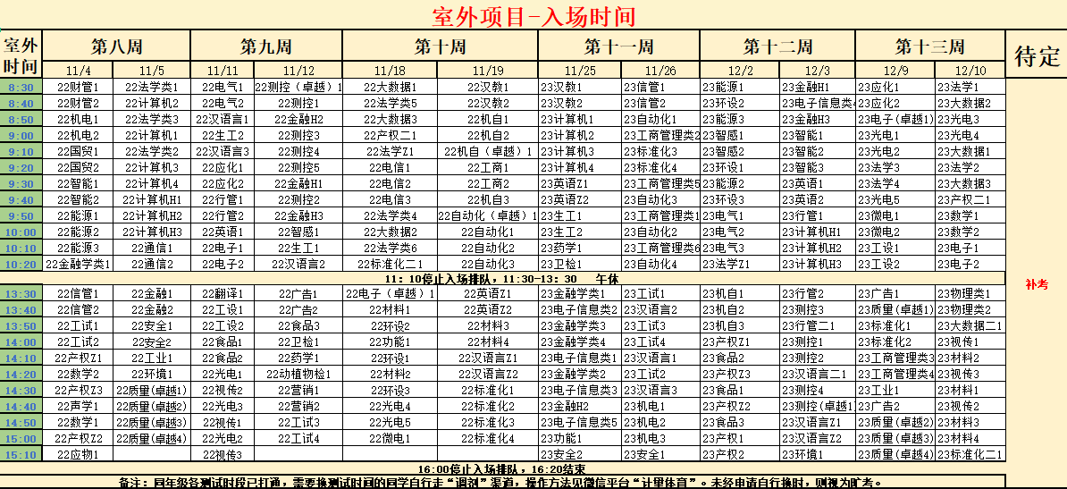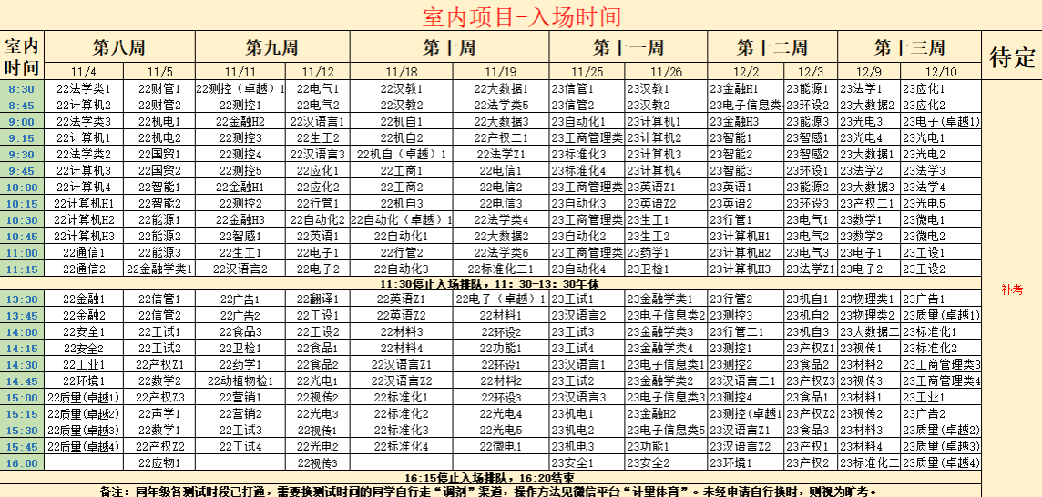 日期为11月4日-12月10日期间的6个周末,形式为集中测试,室内项目与室外项目分别测试。具体的各班各项目初始时段安排详见《附件1》。