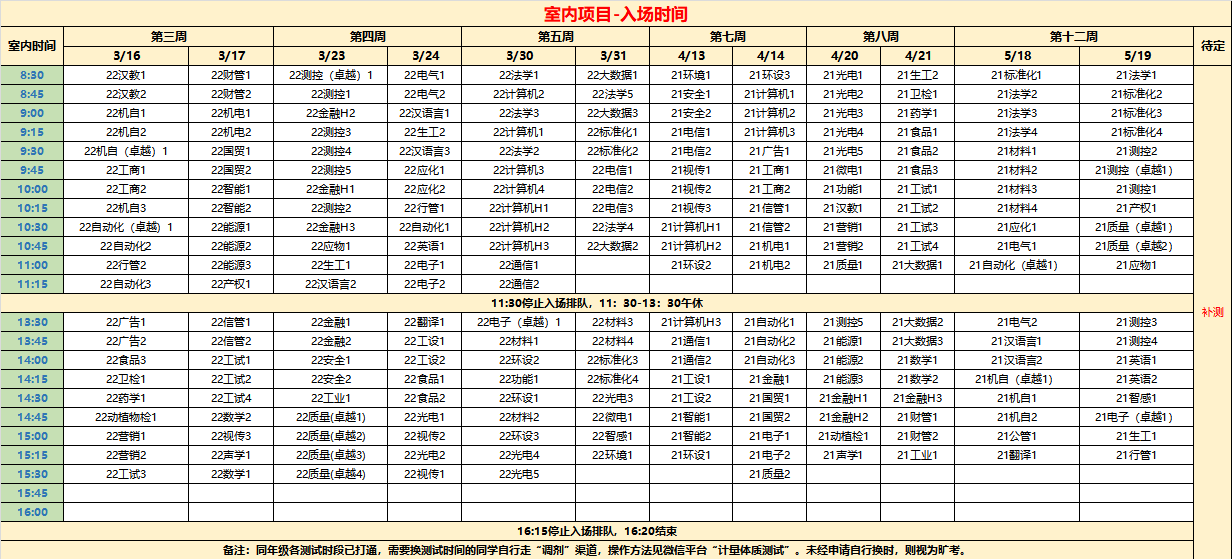 注1:本学期周末测试仅测上述室内项目。50米、800/1000米、仰卧起坐/引体向上、立定跳远,4项体测项目由本学期体育任课教师于体育课内进行测试,成绩将于五月下旬统一导入系统。
