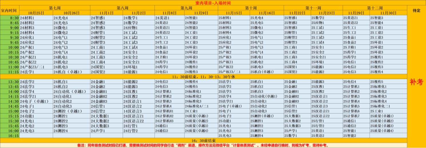 3.迟到的班级,体质测试中心将在不影响后续正常到达班级正常权益的原则下,另行安排,一般需迟到班级自行申请“班级调整”,相关流程及规则见“计量体质测试”微信公众号中《调剂专栏》。