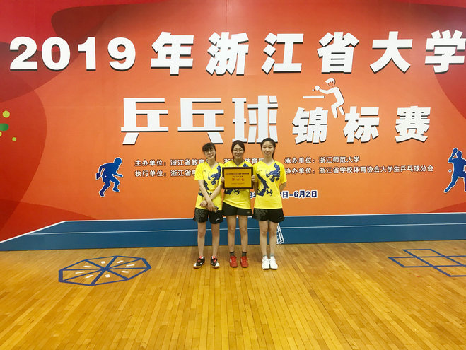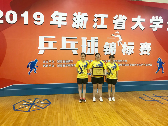 来自经管学院的蒋文琦同学一路过关斩将,在女子单打项目中,击败了获得本次比赛女子团体冠军、实力强劲的浙江财经大学东方学院,最终获得我校历史上第一个省锦标赛女子单打冠军。由蒋文琦、张路安(质安学院)、夏天怡(计测学院)三位同学组成的女子团体队伍,经过一轮轮激烈比拼,最终获得本科组(甲组)女子团体第二。蒋文琦、张路安两位同学获得女子双打第四。