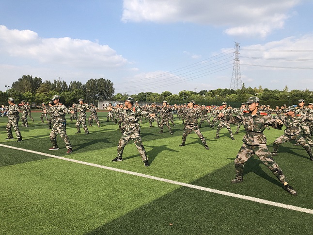 “匕首操”是我校军训的一大特色,由体军部老师和军训教官共同创编完成,分为两段,由“马步平刺”、“左右弹踢”、“翻身下压”等17个动作构成,技法以“刺、撩、挂、劈、挥”等匕首的实战技法组成,动作精练,节奏分明,宛如行云流水,易学易懂。在军训常规训练中加入匕首操的部分,不仅丰富了军训内容,还能增强同学们身体的灵活性和协调性,培养勇敢顽强的战斗作风和尚武精神,是我校新生军训工作优秀经验不断凝练的结果。