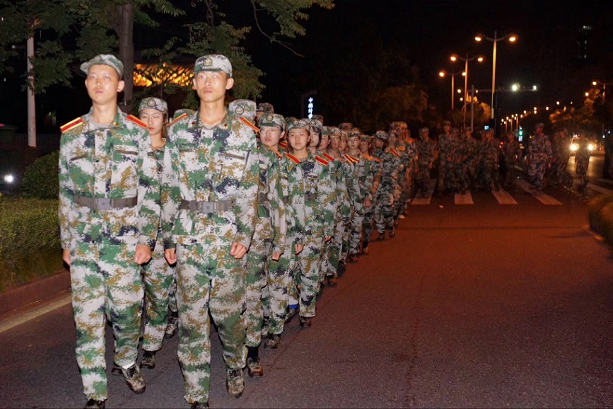 9月18日晚上22:00,随着一声急哨的响起,所有军训队员紧急集合,迅速在集合地整队完毕,拉练正式开始。拉练内容为:从生活区出发,徒步环校一周,最后回到生活区。同学们虽然才刚刚完成一天的训练任务,但紧急集合的哨声又让他们充满干劲,整齐划一的队伍在晚23:45(时间)圆满完成了拉练任务。为了保障学生们夜间训练的安全,体军部联合保卫处、后勤、校医院等部门在沿途马路和路口上安排了多名保安人员梳理交通、宿舍楼安排宿管阿姨为学生开放出入、定点医生保障学生的突发医疗状况。体军部党政领导跟随拉练队伍一道,并在生活区路口协助完成部队横穿马路,为队伍排除路上的障碍。