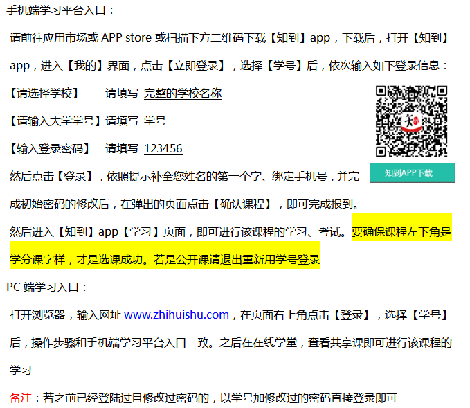 本次补修学习在“知到”APP上进行。学生在网络学习方式:手机下载“知到”APP,学生用学号、学校、初始密码123456注册登录,验证姓名、绑定手机号即可查看课程。